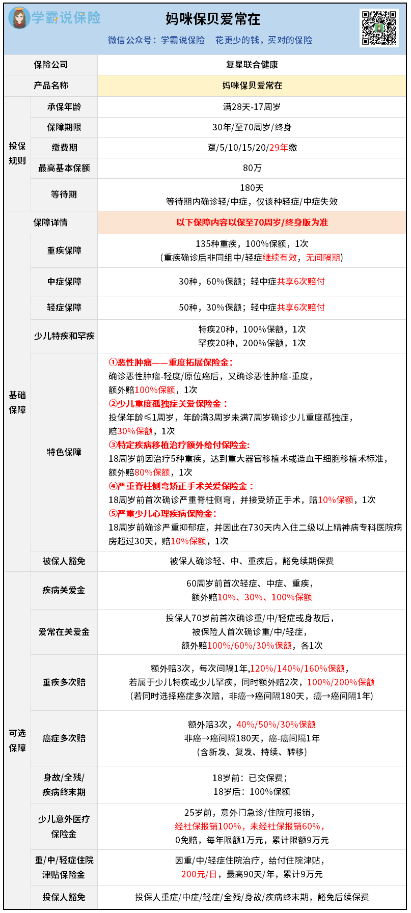 可以附加爱常在关爱金,投保人70岁前若患重/中/轻症或身故,孩子的保障自动翻倍,相当于替父母延续关爱;还能附加少儿意外医疗和住院津贴,保障更全面。
