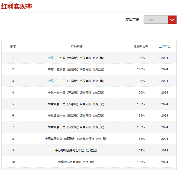 到了今年,中意人寿最新公布的2024年分红实现率,