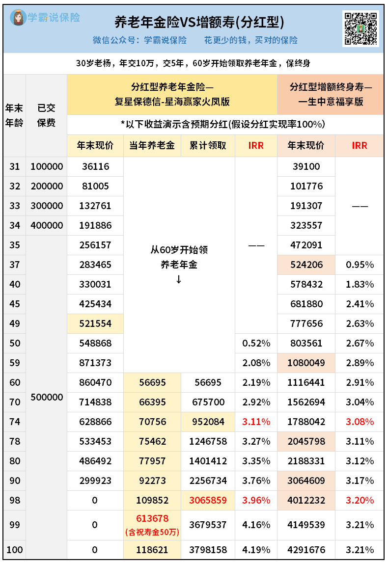 但中后期星海赢家火凤版实现反超,在老杨74岁时,IRR达到了3.11%,100岁甚至达到4.19%。
