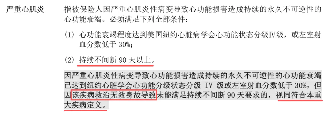 这个是行业创新责任,以严重心肌炎为例,普通重疾险必须按疾病定义要求,需满足“新功能状态分级IV级且持续90天”才能赔付: