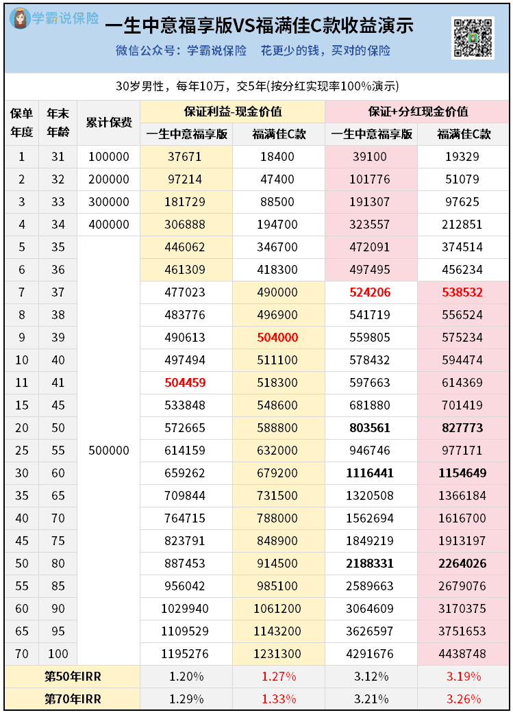 整体来看,无论是保证收益、还是算上分红的总收益,前6年都是一生中意福享版领先,第7年起福满佳C款反超。