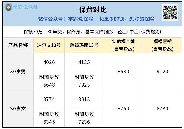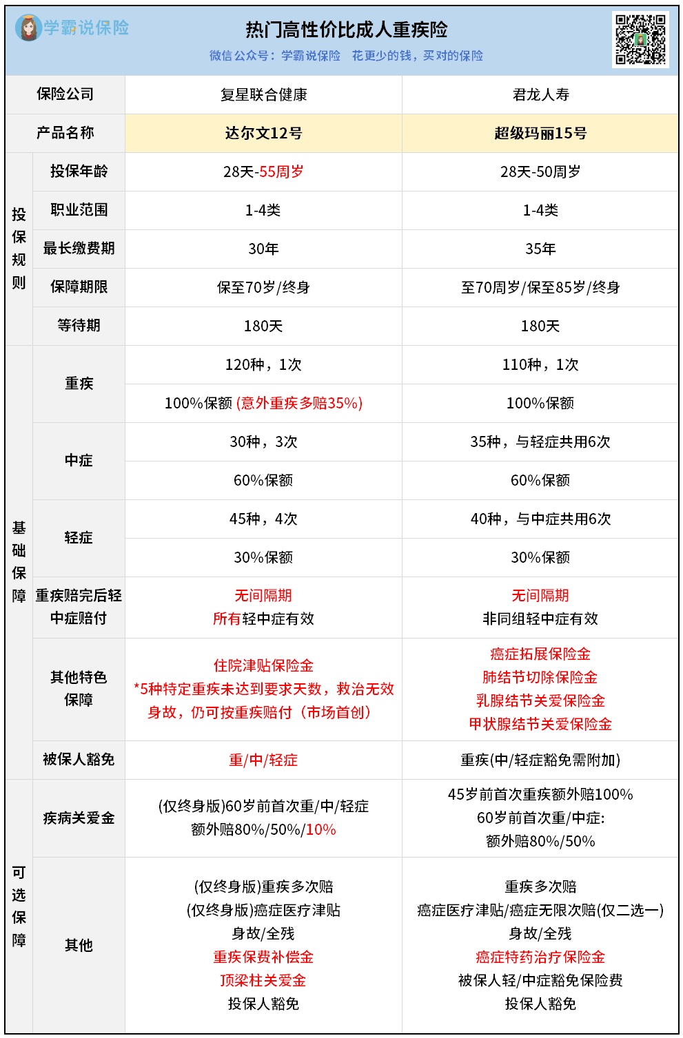 当然,如果预算充足,想确保以后重疾险能理赔,选择附加身故保障,那达尔文12号和超级玛丽15号也是更好的选择——