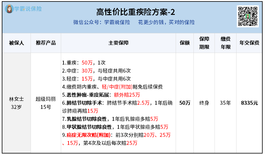 预算相对充足、追求癌症保障的朋友,也可以参考这个方案。