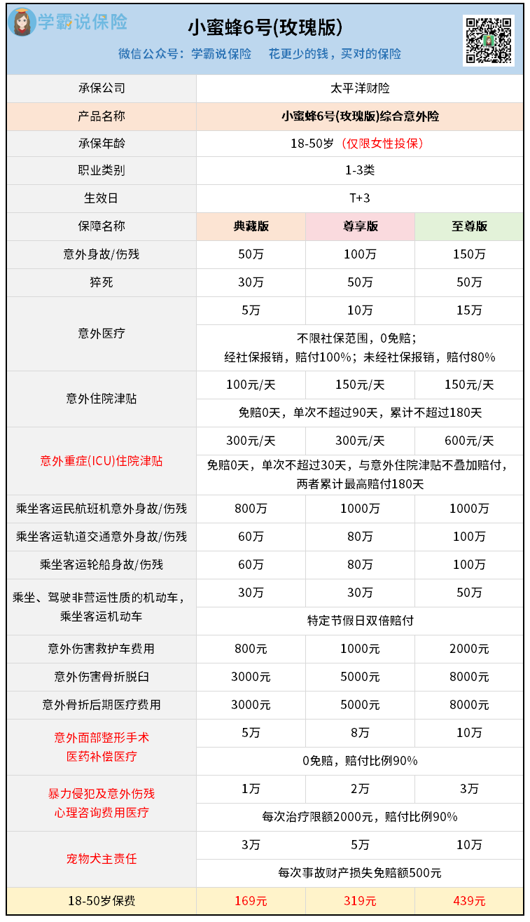 女性朋友:喜欢玫瑰版的专属保障就选玫瑰版,想要更充足的保额,可入手150万的至尊版;更追求低价,小蜜蜂6号也完全够用。