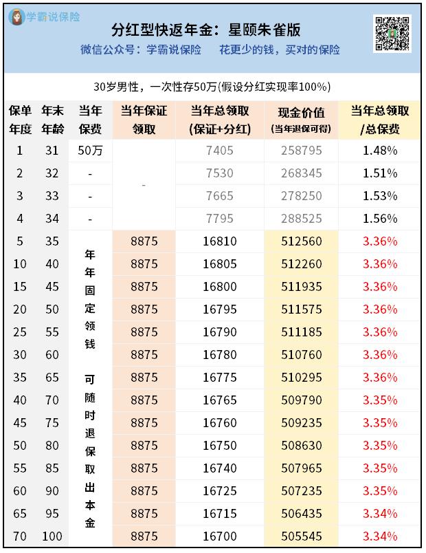 万一急用钱,第5年后退保能拿回50万本金,不怕亏钱。