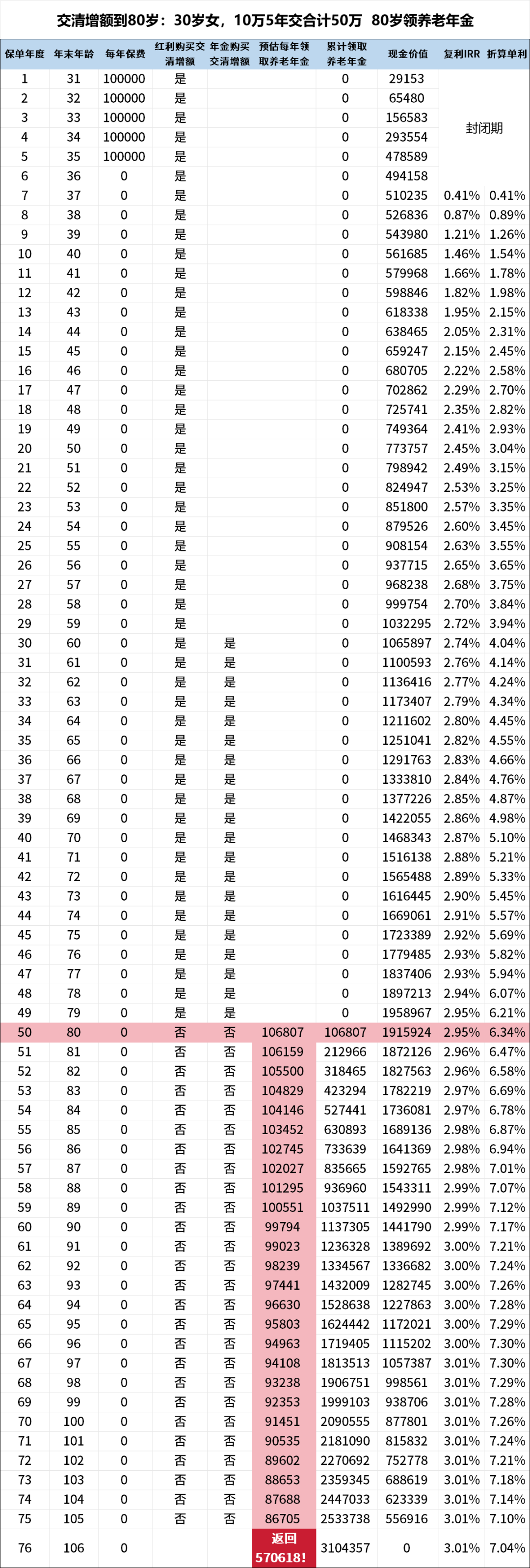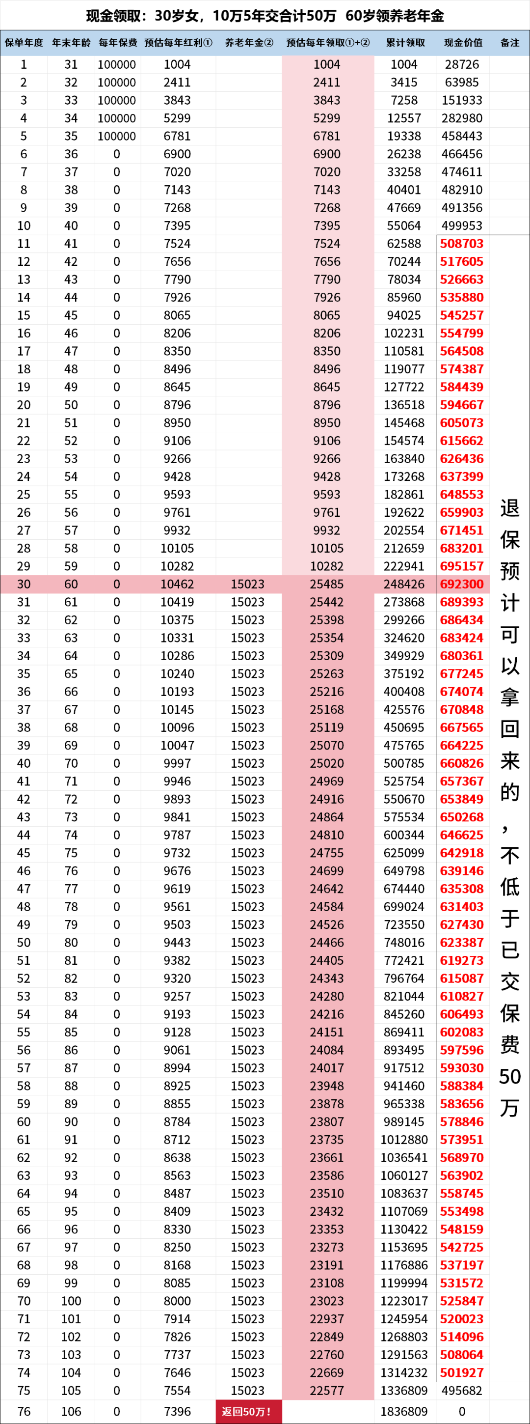 到了106岁保单结束的这一年,还可以把交的50万全部拿回来。