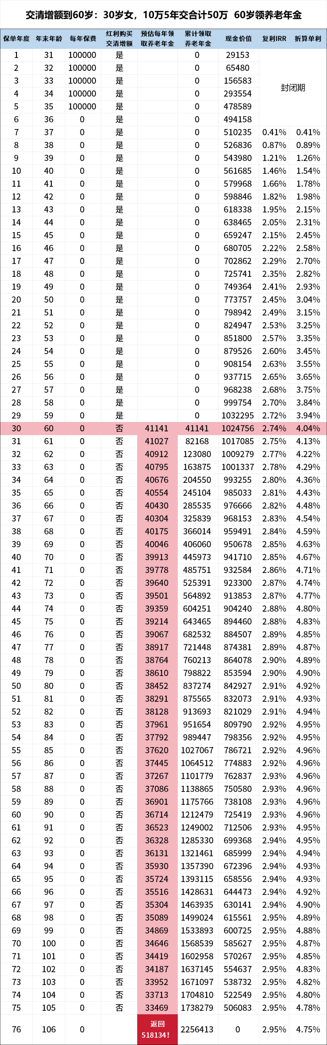 拉长时间看IRR在3.0%,活脱脱是一份穿着年金衣服的增额终身寿!