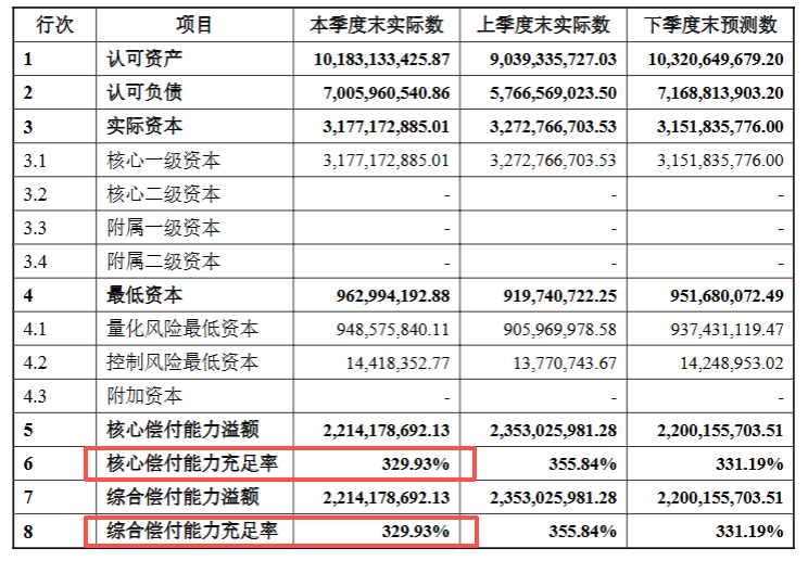 最新核心偿付能力充足率、综合偿付能力充足率都是329.93%,