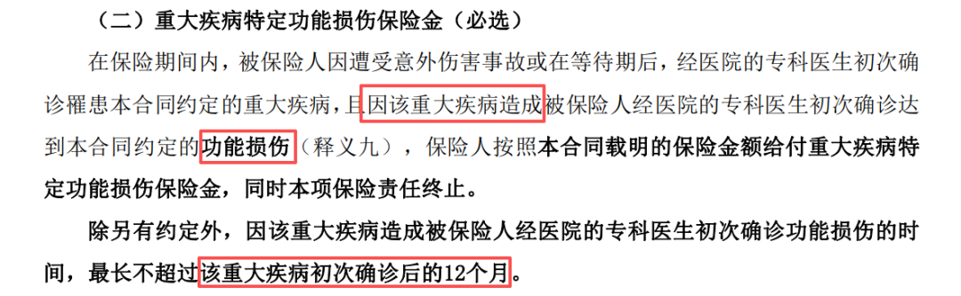 首次重疾确诊12个月内,因该重疾导致特定功能损伤,可以再赔100%保额。
