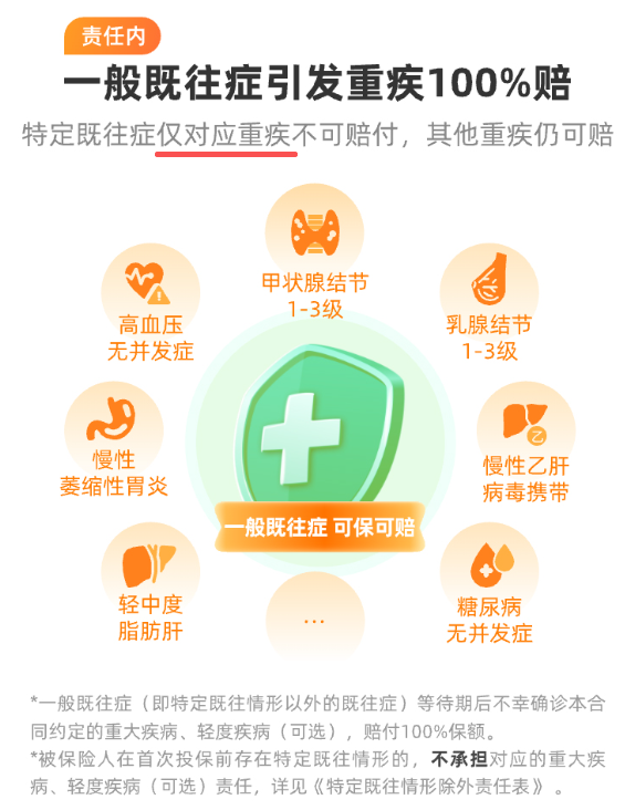一般既往症,如乳腺/甲状腺结节1-3级、高血压无并发症、慢性萎缩性胃炎等等情况都能100%赔。