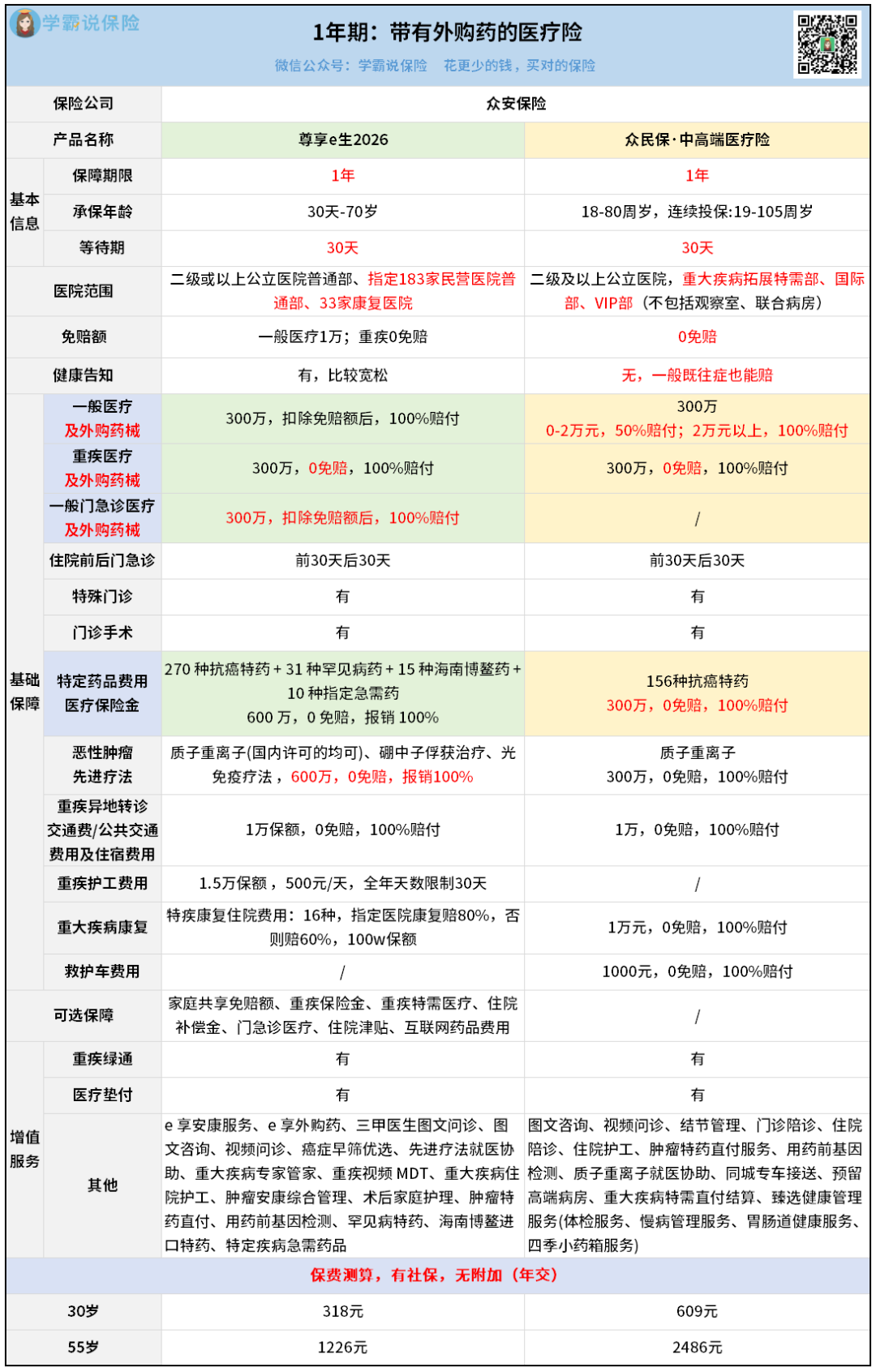 所以从保障来看,尊享e生2026和众民保·中高端医疗险也是非常优秀的产品。