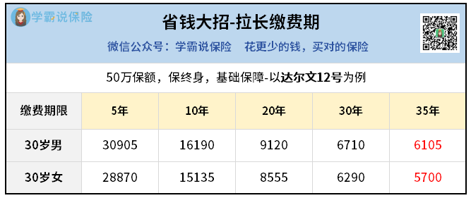 很明显,缴费期越长,每年交钱越少。