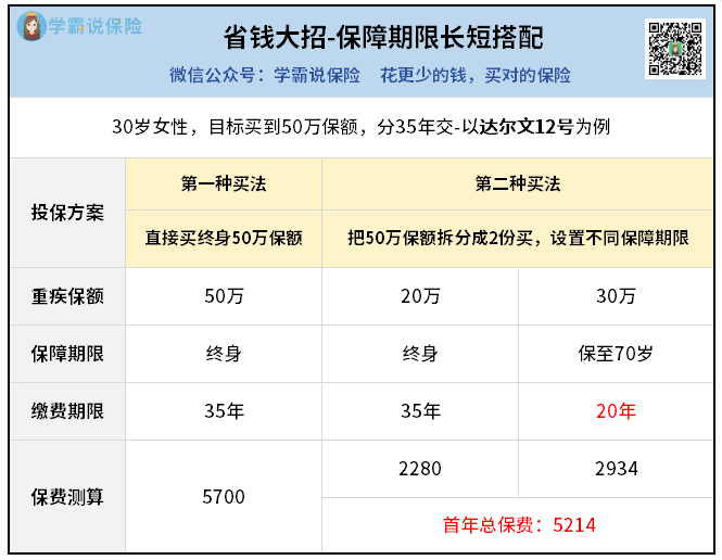 先买20万终身打底,再搭配30万保到70岁。