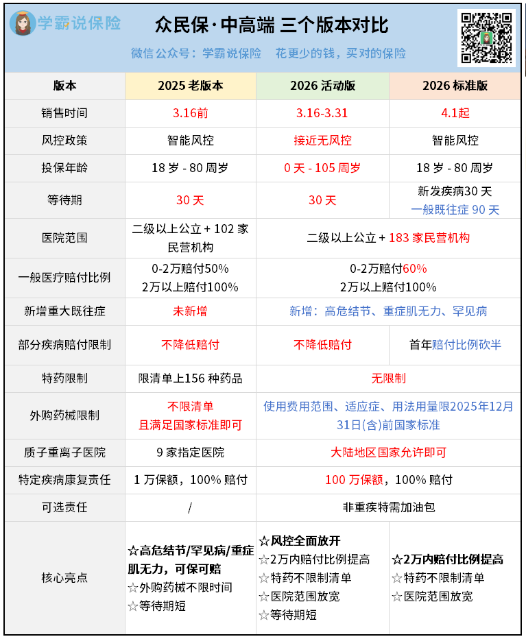 对比2025老版本,升级后的众民保·中高端有6大亮点,4大调整。