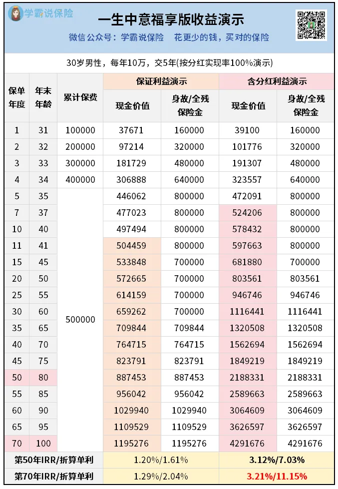 比如下面这款一生中意福享版,堪称现在分红险的天花板: