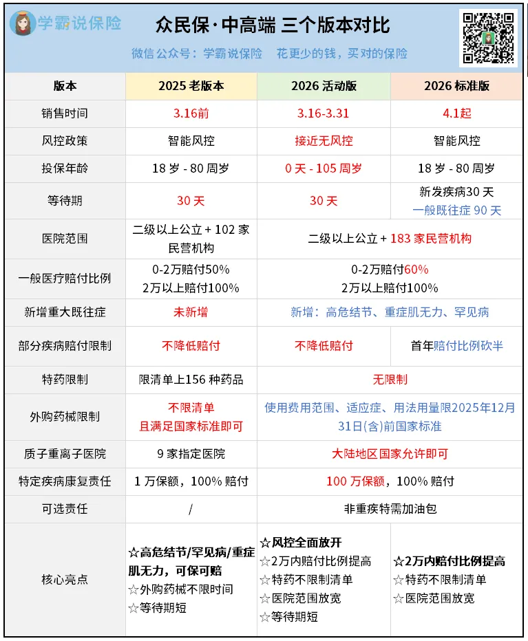 第二个大事,众民保·中高端医疗险3月16日就要升级到2026版了。