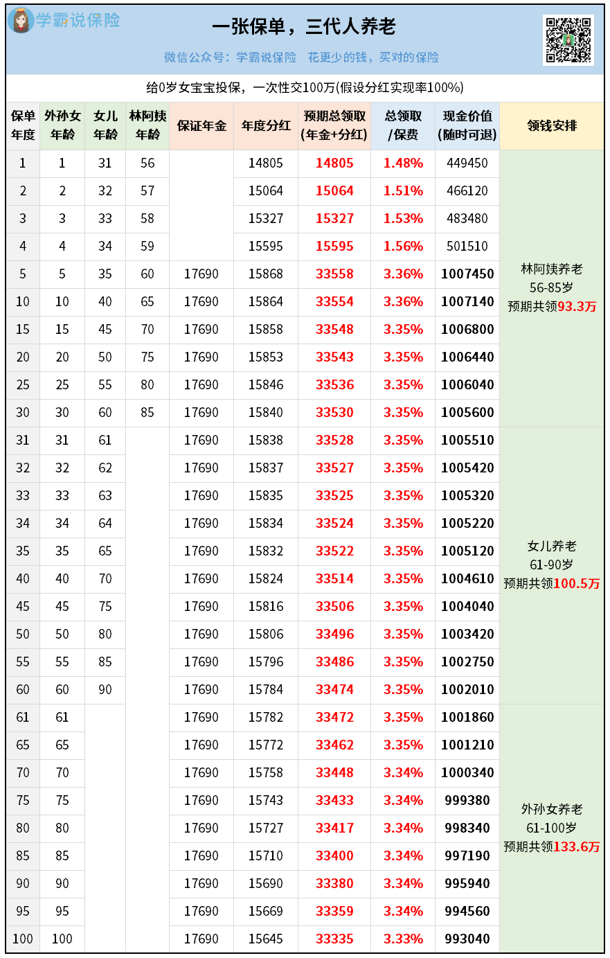 ②三代人领足100年,保费基本没变,随时可以拿回来