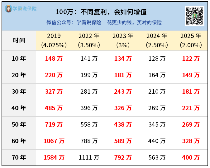 2019年买4.025%的产品,100万放个20年,就能增值到220万,翻了一倍不止!